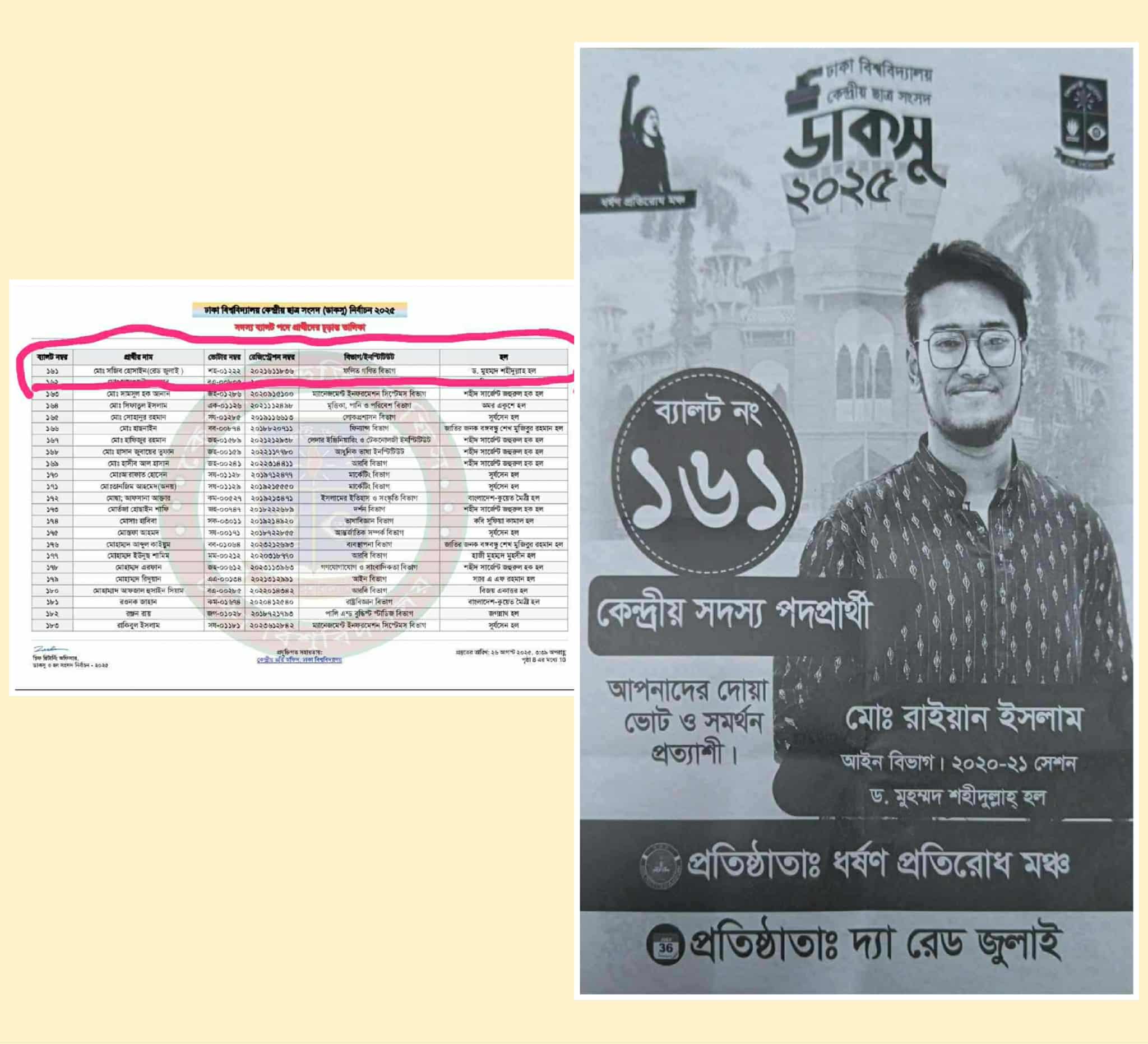 ডাকসু’র ভুয়া প্রার্থীতা দাবি করে মোঃ রাইয়ান ইসলামের চাঁদাবাজি। মায়ের আঁচল রিপোর্ট