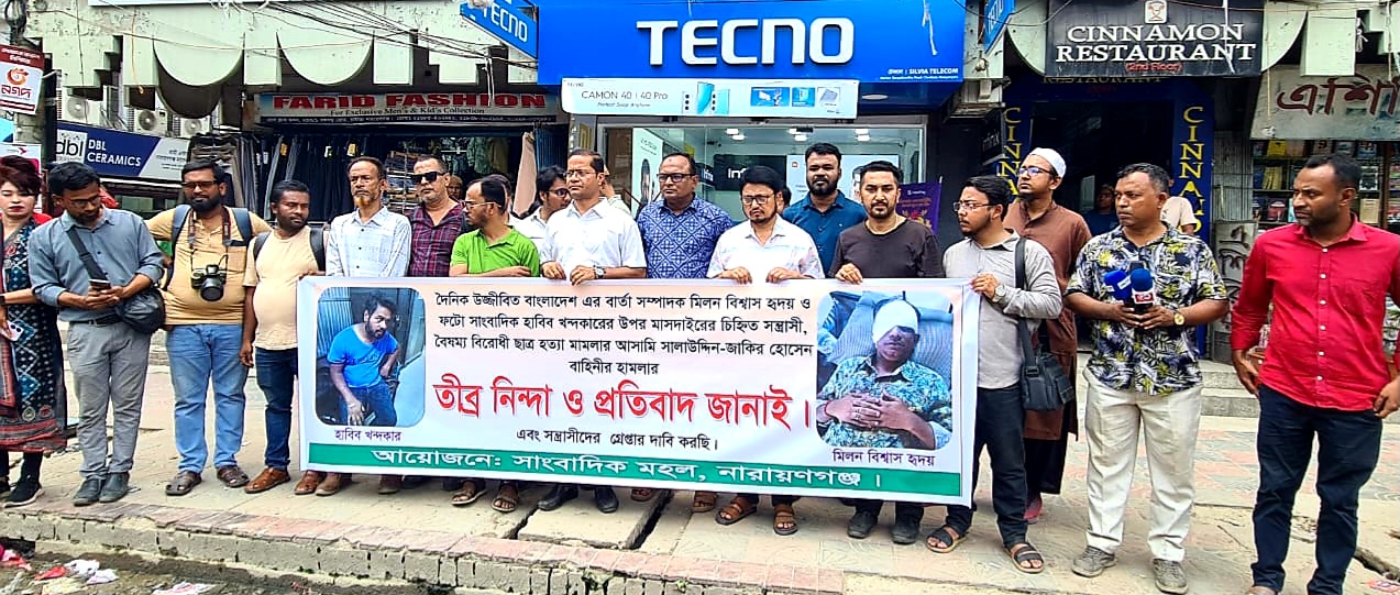 নারায়ণগঞ্জে দুই সাংবাদিকের উপর সন্ত্রাসী হামলার প্রতিবাদে মানববন্ধন।। মায়ের আঁচল রিপোর্ট