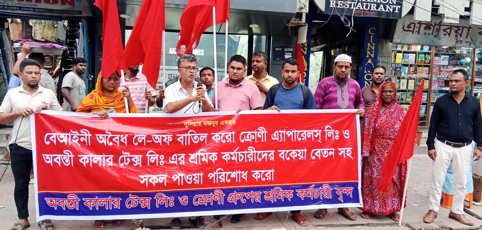 তিনি আরও বলেন, নারায়ণগঞ্জের ফতুল্লার ক্রোণী এ্যাপারেলস্ লিমিটেড ও অবন্তী কালার লিমিটেড এর প্রায় ৫ হাজার শ্রমিক/কর্মচারীদের বিনা নোটিশে কোন কারণ ছাড়া বিগত ১ বছর পূর্ব হতে ধাপে ধাপে চাকরিচ্যুত করা হয়েছে। চাকরিচ্যুত করা শ্রমিকরা