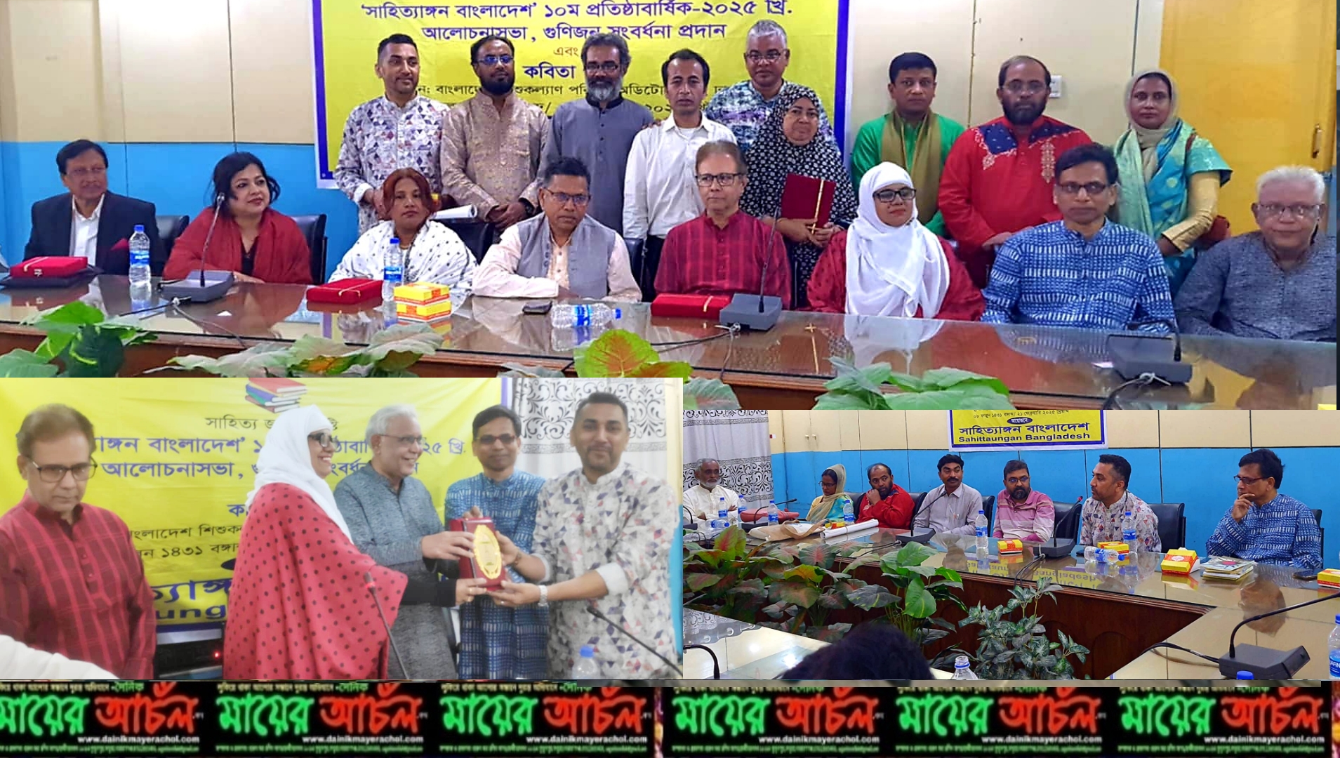 সাহিত্যাঙ্গন বাংলাদেশের ভূমিকা ও ভবিষ্যৎ পরিকল্পনা: সাহিত্যাঙ্গন বাংলাদেশ গত দশ বছর ধরে সাহিত্যচর্চাকে প্রাতিষ্ঠানিক রূপ দিতে নিরলসভাবে কাজ করে যাচ্ছে। সংগঠনটি নবীন লেখকদের জন্য কর্মশালা, সাহিত্যসভা, সাহিত্য প্রকাশনা এবং গবেষণামূলক কার্যক্রম পরিচালনা করছে। বাংলা সাহিত্যকে বিশ্বমানের সাহিত্যচর্চার সঙ্গে যুক্ত করার জন্য অনুবাদ কর্মসূচির ওপরও বিশেষ গুরুত্ব দেওয়া হচ্ছে। সংগঠনের সভাপতি কবি সাংবাদিক সৈয়দা রুখসানা জামান শানু বলেন, “সাহিত্যের চর্চা ও প্রসারের মাধ্যমে আমরা একটি বুদ্ধিবৃত্তিক সমাজ গড়ে তুলতে চাই। তিনি আরো বলেন, বাংলা ভাষা ও সাহিত্যকে বিশ্ব দরবারে প্রতিষ্ঠিত করতে আমাদের প্রচেষ্টা অব্যাহত থাকবে। ‘‘সাহিত্যাঙ্গন বাংলাদেশের” এই দশম প্রতিষ্ঠাবার্ষিকী আয়োজন বাংলা সাহিত্য ও গবেষণার অগ্রযাত্রায় একটি গুরুত্বপূর্ণ মাইলফলক। আলোচনাসভা, গুণিজন সংবর্ধনা এবং কবিতা পাঠের মাধ্যমে এই আয়োজন শুধু সাহিত্যিকগণের মিলনমেলা নয়, বরং নতুন প্রতিভার বিকাশ ও সাহিত্যপ্রেমীদের জন্য অনুপ্রেরণা হয়ে কাজ করবে। দীর্ঘ চার ঘন্টার ফলপ্রসু আলোচনায় বহুবিদ দিক নির্দেশনার মাধ্যমে বাংলা সাহিত্যকে বিশ্ব দরবারে তুলে ধরার লক্ষ্যে এমন আয়োজন ভবিষ্যতেও অব্যাহত থাকবে বলে আশা প্রকাশ করেছেন আয়োজকগণ। একই মঞ্চে সোহেল মুহাম্মদ ফখরুদ-দীন সম্পাদনায় ৬১৮ পৃষ্ঠাব্যাপী হযরত মুহম্মদ (সা:) এর জীবনী সংকলন ‘আখেরি পয়গম্বর নামক’ গ্রন্থটির মোড়ক উন্মোচন করা হয়। এছাড়াও কবি মো: ওসমান গনি রচিত ‘হেমলতার বিষ পেয়ালা’ নামক কাব্যগ্রন্থের পাঠ উন্মোচন করা হয়।