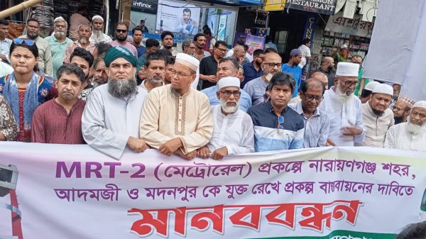 নারায়ণগঞ্জ কে মেট্রোরেল এমআরটি-২ তে যুক্ত করার দাবিতে দলমত নির্বিশেষে নারায়ণগঞ্জের সর্বস্তরের মানুষের নেতৃত্বে মানববন্ধন কর্মসূচি পালিত হয়েছে। হারুন অর রশিদ সাগর,নারায়ণগঞ্জ জেলা প্রতিনিধি:- নারায়ণগঞ্জ শহর, আদমজী, মদনপুরকে মেট্রোরেল (এমআরটি